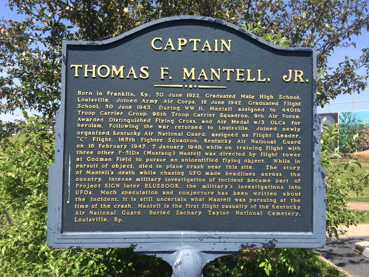 Placed at the site of Mantell’s crash in 2001, a historical plaque remains in Franklin just off I-65 — the same town of his birth — along with unanswered questions.
