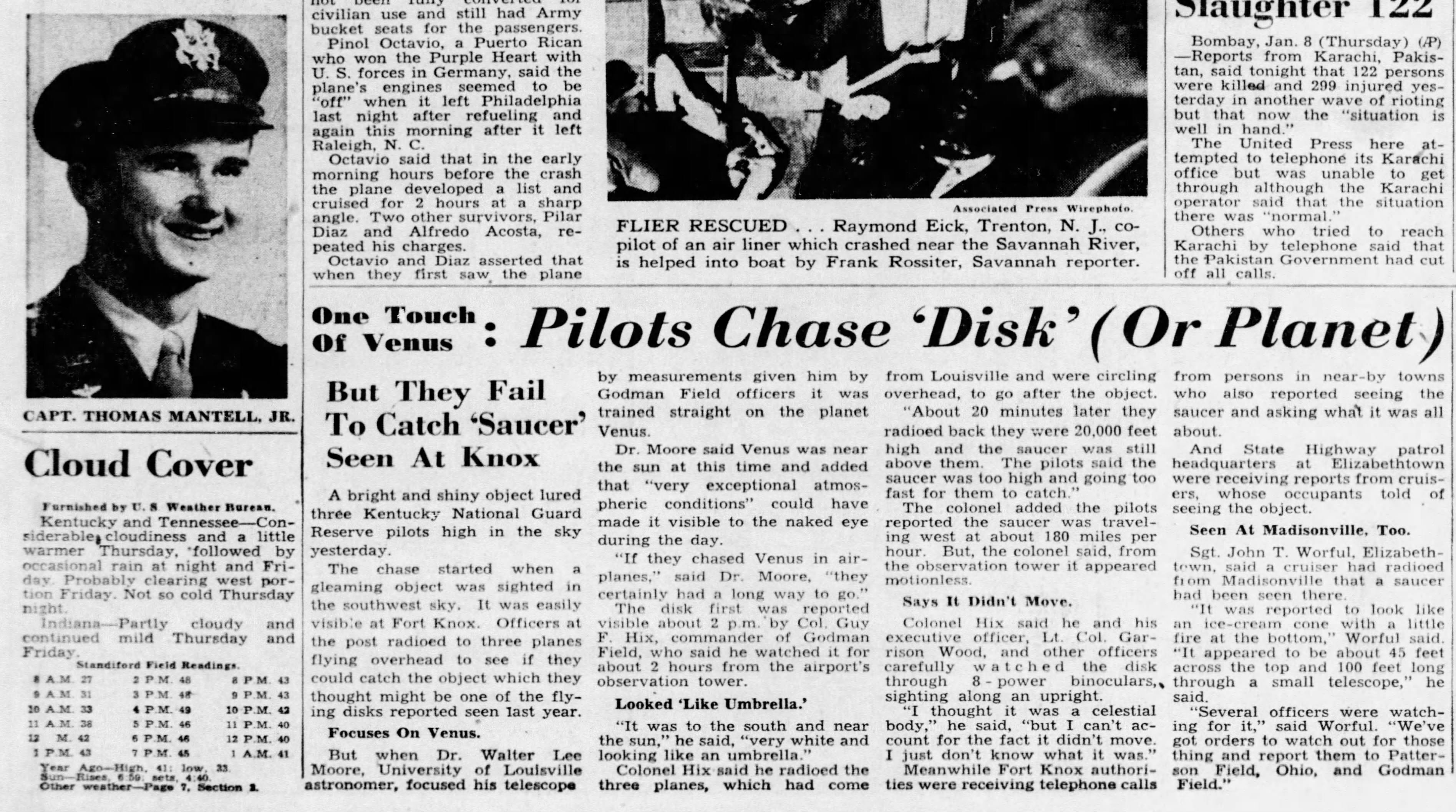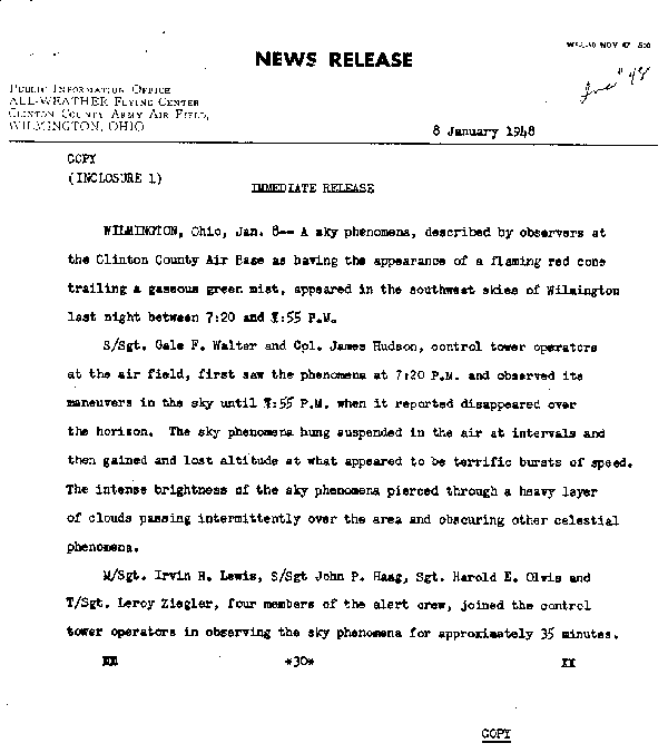 On 7 January 1948, Godman Army Airfield at Fort Knox, Kentucky, received a report from the Kentucky Highway Patrol of an unusual aerial object near Madisonville. Reports of a westbound circular object, 250–300 feet (80–90 m) in diameter, were received from Owensboro and Irvington. At about 1:45 p.m., Sergeant Quinton Blackwell saw an object from his position in the control tower at Fort Knox. Two other witnesses in the tower also reported a white object in the distance. Colonel Guy Hix, the base commander, reported an object he described as “very white,” and “about one fourth the size of the full moon … Through binoculars it appeared to have a red border at the bottom … It remained stationary, seemingly, for one and a half hours.” Observers at Clinton County Army Air Field in Ohio described the object “as having the appearance of a flaming red cone trailing a gaseous green mist” and observed the object for around 35 minutes.