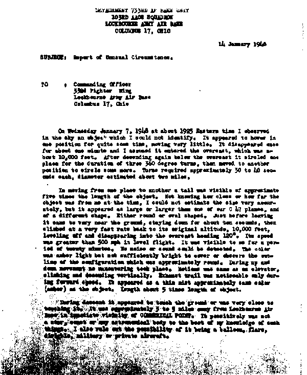 Another observer at Lockbourne Army Air Field in Ohio noted, “Just before leaving it came to very near the ground, staying down for about ten seconds, then climbed at a very fast rate back to its original altitude, 10,000 feet [3,000 m], leveling off and disappearing into the overcast heading 120 degrees. Its speed was greater than 500 mph [800 km/h] in level flight.”