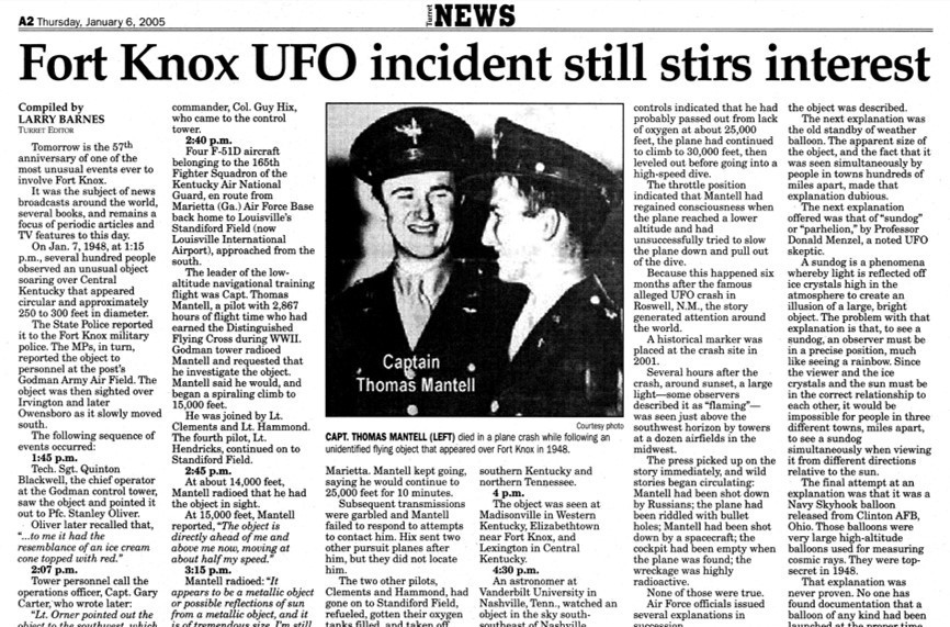 After a few more garbled transmissions, communications with Mantell ceased. By 5 p.m., debris from his airplane was discovered in Shelby County, southeast of Louisville. Investigators noted that his seatbelt had been shredded.